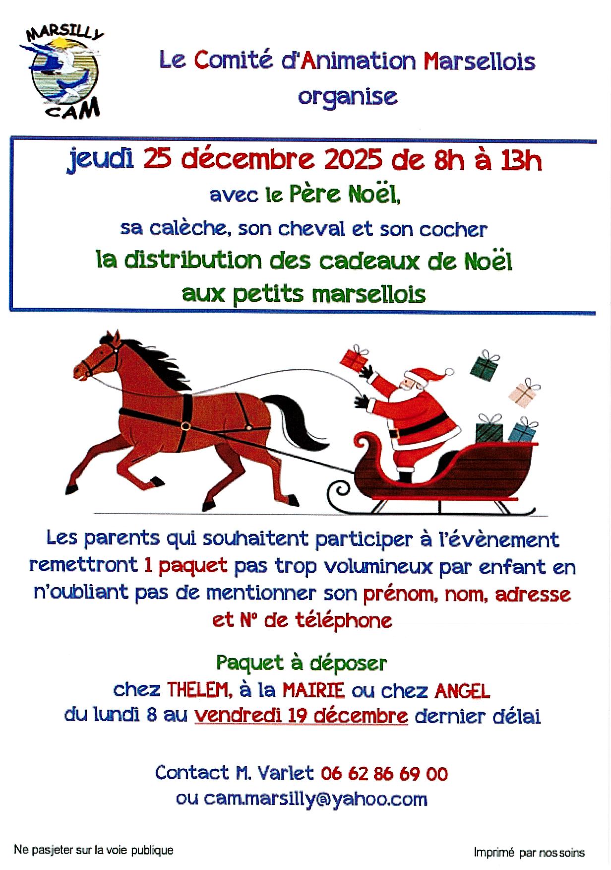 Le Comité d’animation Marsellois organise jeudi 25 décembre de 8h à 13h avec le Père Noël sa calèche, son cheval et son cocher la distribution des cadeaux de Noël aux petits marsellois.